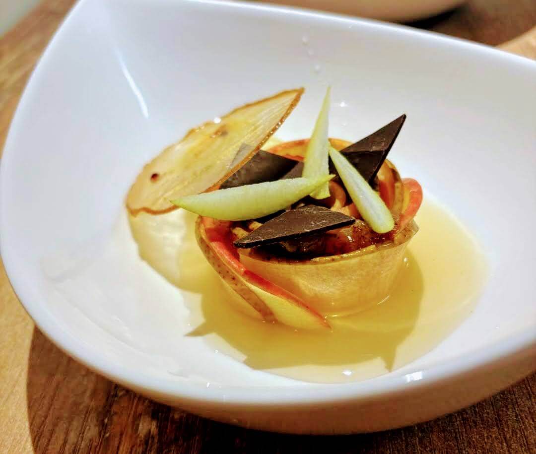 Le soir, on propose par exemple une poêlée de pétoncles avec une mousseline de topinambour, de la joue de porc confite avec un jus à la bière, une tombée de choux avec un pressé de pommes de terres et une rosace pommes/poires en dessert, à l’essence de cannelle et accompagnée d’un chutney.