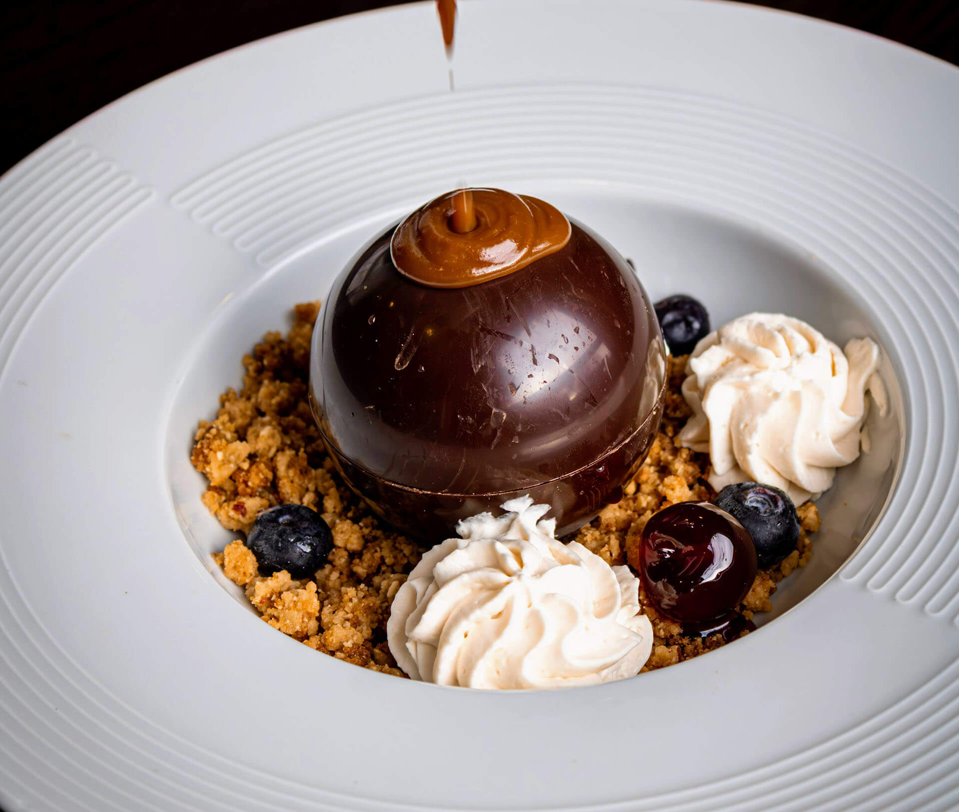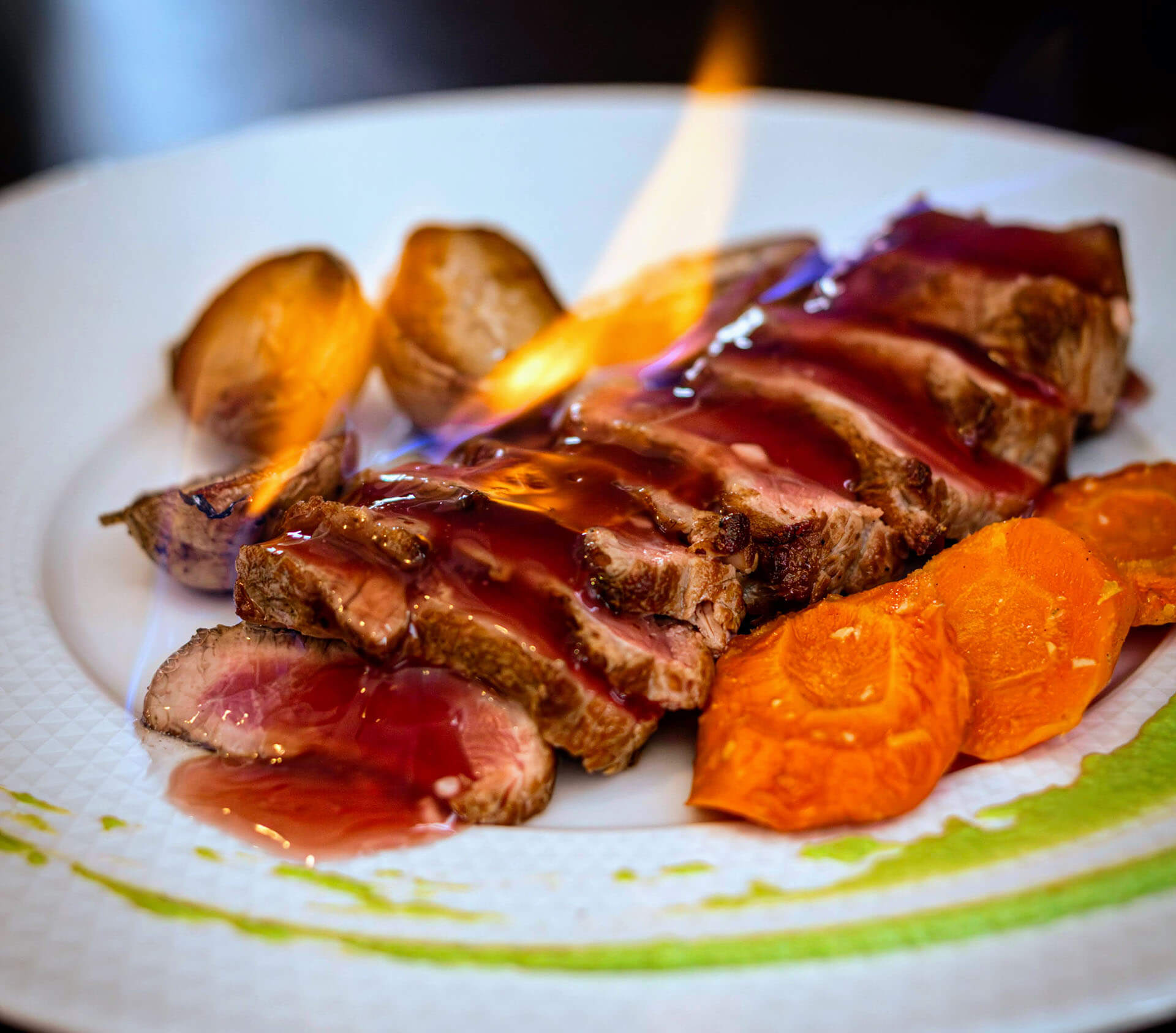 Jamil Ahmed : Le soir, par exemple, on propose une cassolette de noix de Saint-Jacques et de crevettes, mais aussi du magret de canard et une sphère au chocolat dans la carte des desserts. Au niveau des plats traditionnels, il y a par exemple la tête de veau, ou bien encore la truffade.