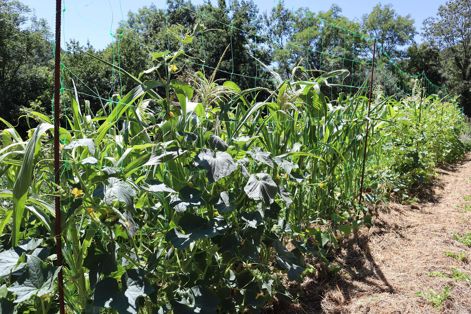J’essaye d’utiliser des engrais verts et j’ai tendance à cultiver plusieurs légumes différents au même endroit. J’ai? par exemple? un espace où je fais pousser des haricots, du maïs et du concombre grimpant sur filets.