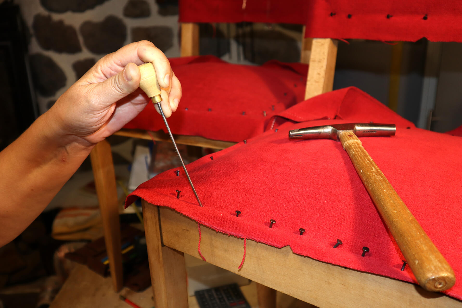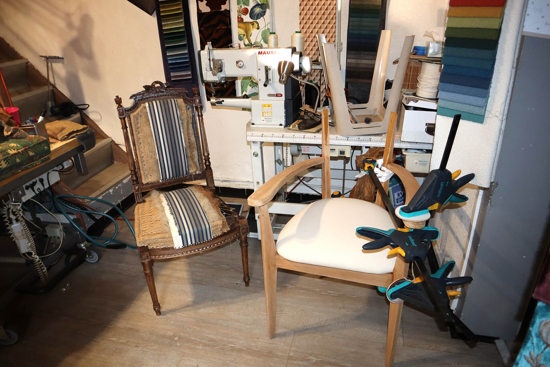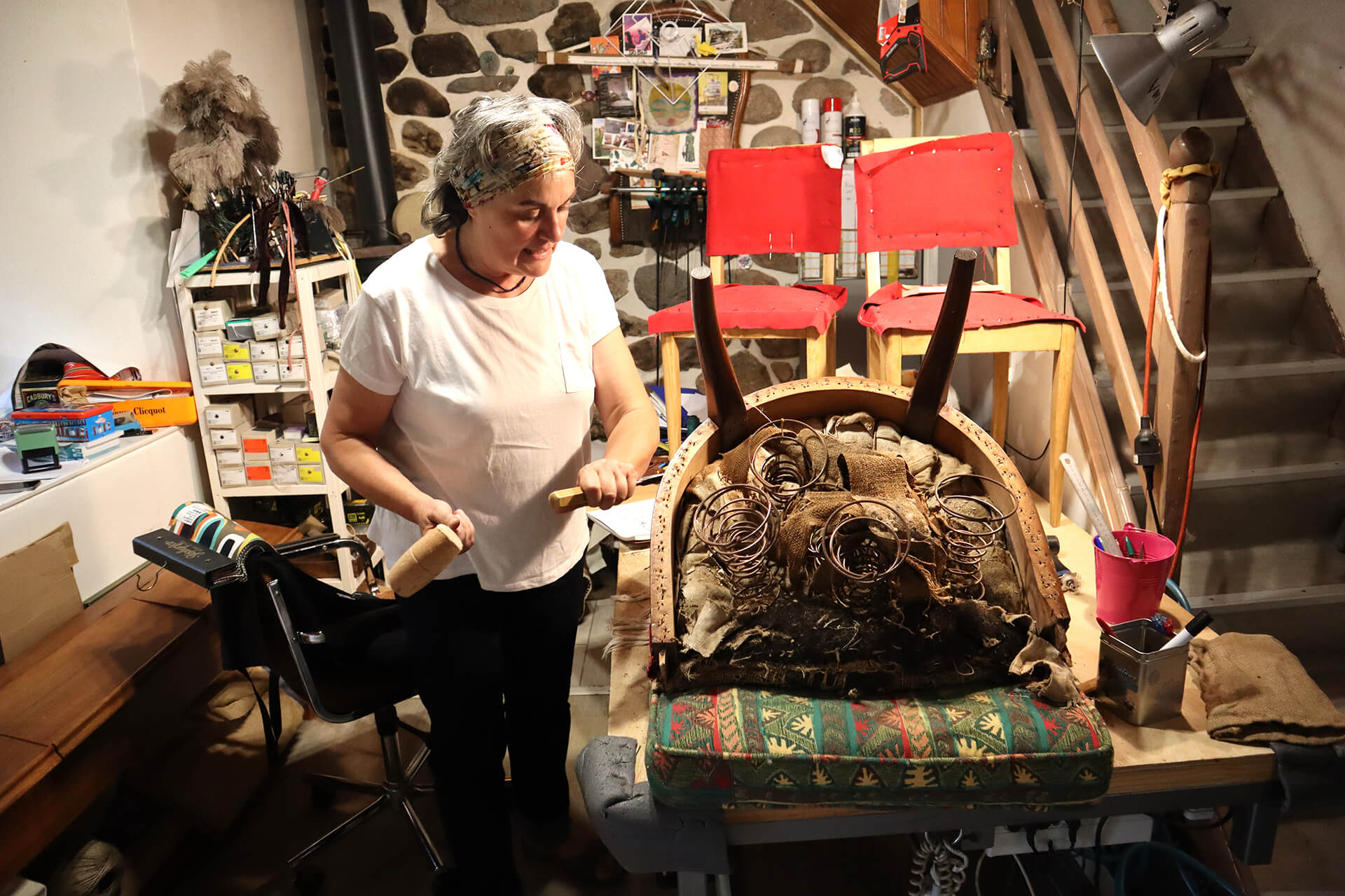 Tapissière d’ameublement en sièges, Nathalie Gibert-Chabat répare et redonne du cachet à des chaises anciennes depuis son petit atelier de Lavoûte-sur-Loire qu’elle a ouvert en 2019. Elle utilise pour cela des tissus de qualité comme ceux que l’on propose à la Maison Thevenon à Saint-Germain-Laprade et des outils anciens comme par exemple une cardeuse, un vieil outil que l’on retrouve chez tous les anciens tapissiers qui travaillent de façon artisanale.