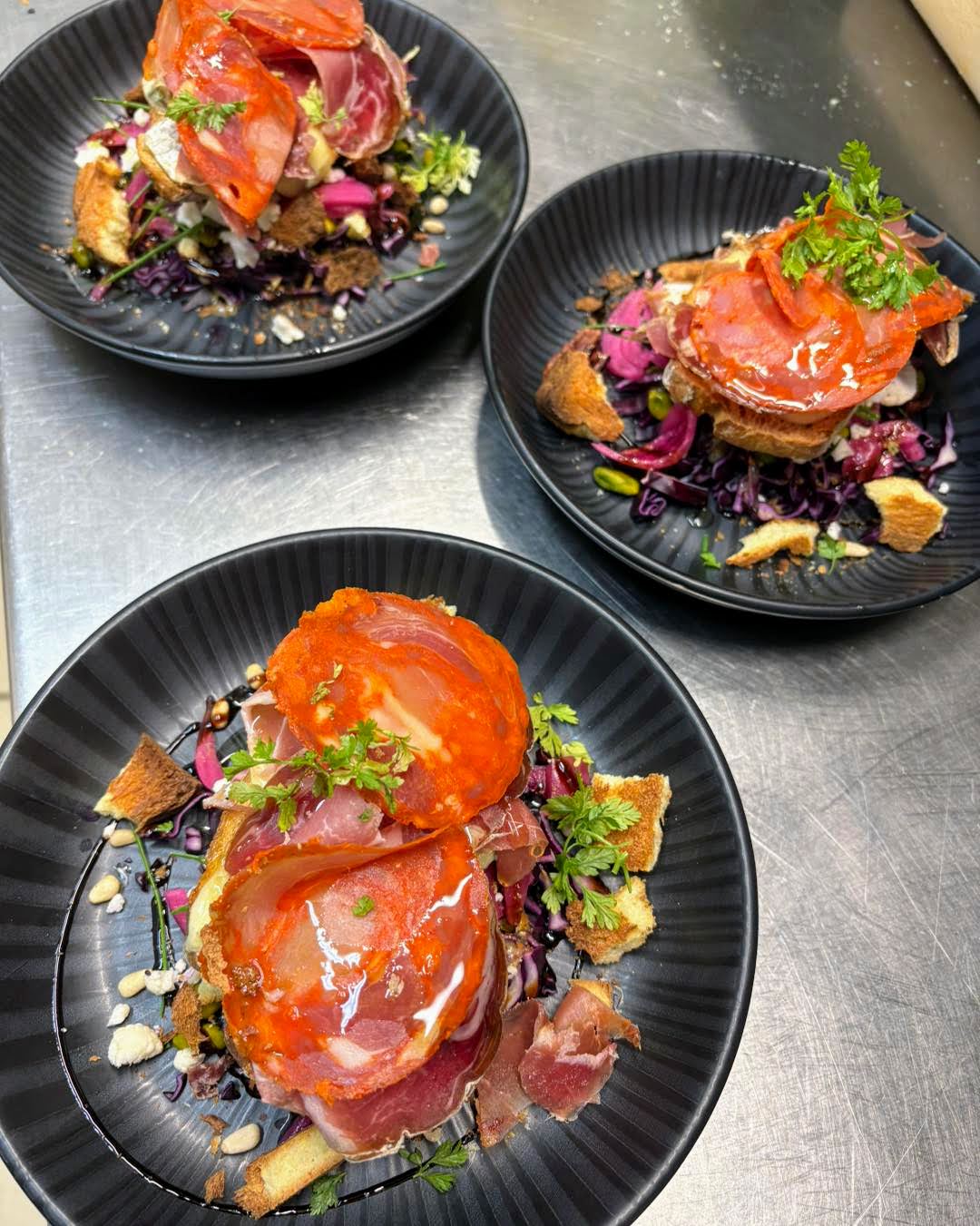 Du côté des desserts, la tarte tiède aux pommes caramélisées, amandes et noix, caramel et douceur. Le brownies fondant aux trois fruits, crème pistache et chantilly.