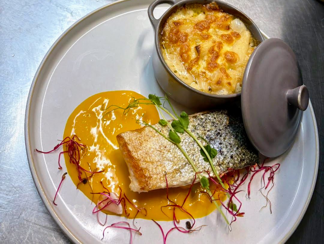 Il y a par exemple le pâté en croûte que je propose en entrée et puis il y a les plats mijotés, comme la blanquette de veau, la joue de porc. J’aime bien cuisiner le poisson à la grenobloise ou en croûte. Dans le menu du jour, les clients peuvent choisir entre deux entrées, deux plats et deux desserts.